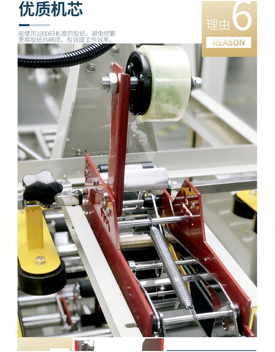 VFC-50折蓋封箱機能對紙箱的上蓋進行自動折合,但紙箱大小變化時,需要人工調整梯形絲杠來調整封箱寬度和高度。紙箱上蓋自動折入,平穩順暢,封箱作業一氣呵成,美觀省力,可配合自動化包裝系統使用。 折蓋封箱機新型貼帶器,不用鼓風機吹挺膠帶,利用壓片裝置,使膠帶挺立不彎下而造成不能粘貼。上下升降使用進口剎車缸,定位準確。